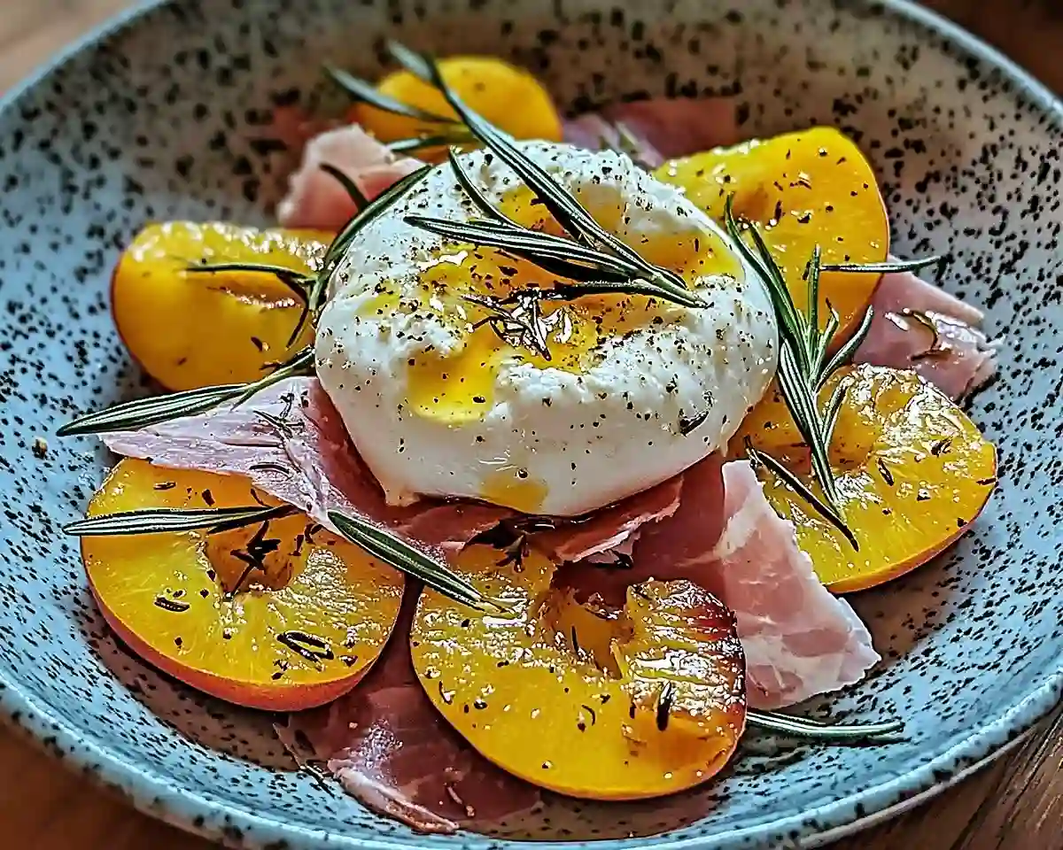 Voilà, vous avez maintenant entre les mains LA recette qui va transformer vos apéros d’été en moments dont on se souvient. Ce Burrata sur Carpaccio de Pêches Blanches Rôties au Romarin & Miel Pimenté, c’est bien plus qu’un plat – c’est une invitation à ralentir, à savourer, à partager.