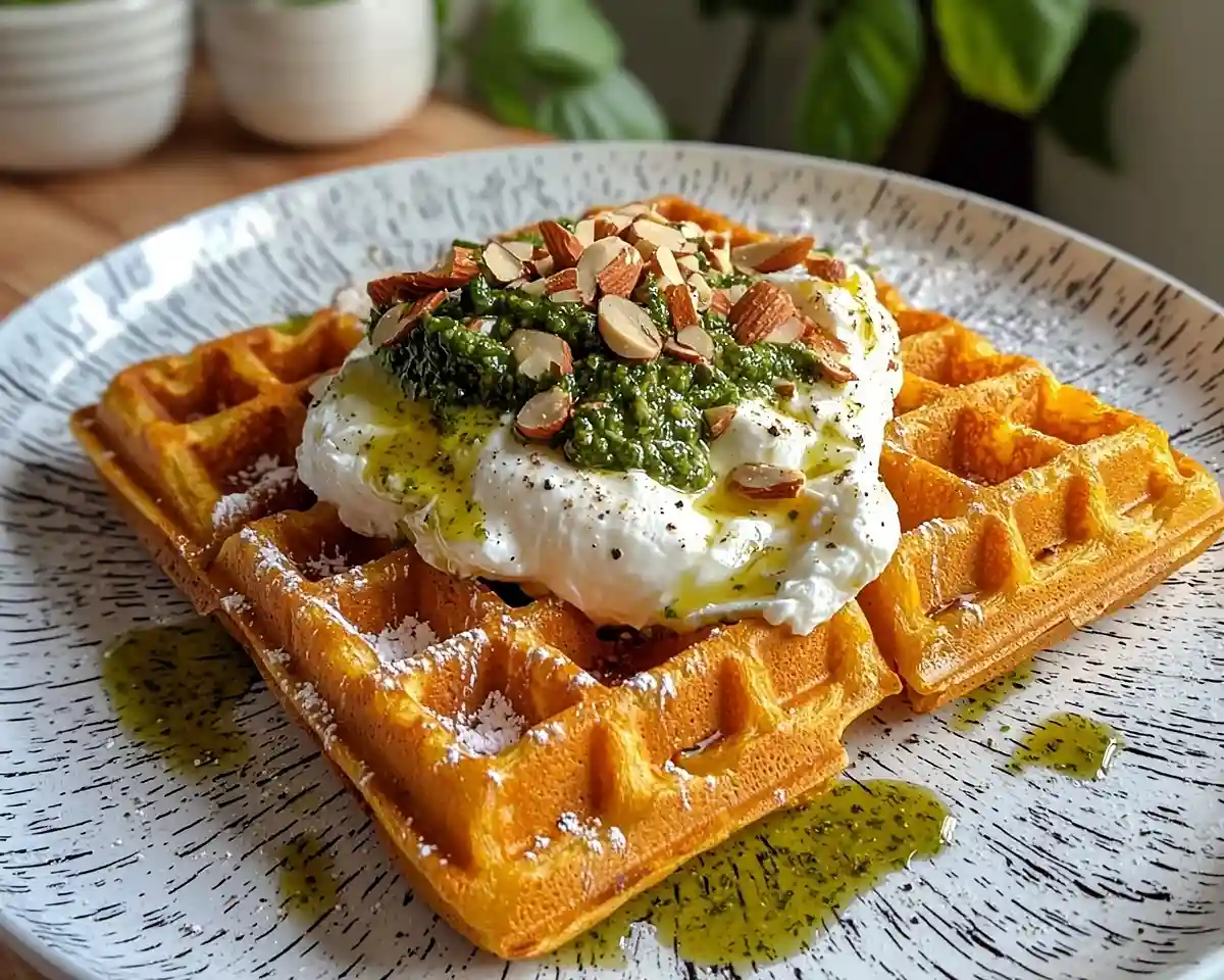 Gaufre de Carotte au Cumin avec Burrata crémeuse, Pesto de Coriandre et Amandes Grillées… un plat frais et plein de saveurs à tester !