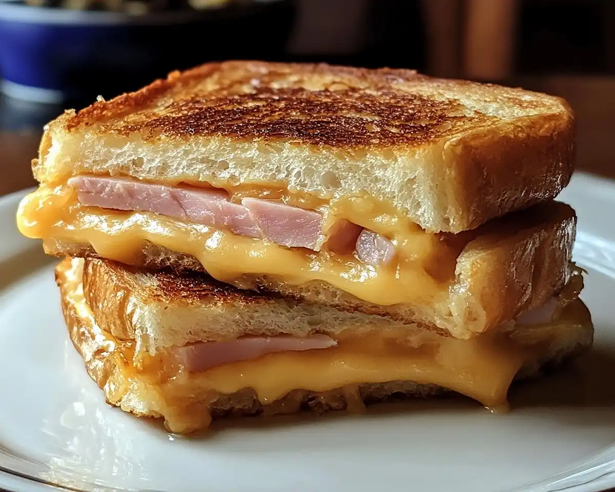 🧱 Astuce architecture du sandwich : Le secret de ce cœur coulant, c’est de bien empiler les couches : cheddar en bas, jambon au milieu, cheddar en haut. Comme ça, le fromage entoure le jambon de tous côtés et fond uniformément vers le centre. Si t’as l’impression que ça déborde, c’est totalement normal — c’est même le signe que t’as mis suffisamment de fromage.