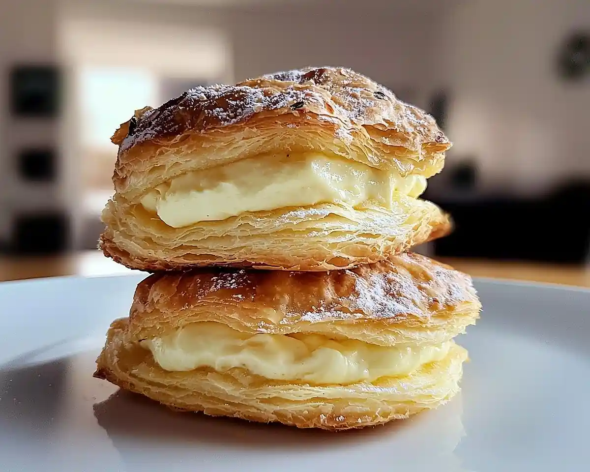 - Montage : percez le dessous des choux, garnissez de crème, déposez sur les disques feuilletés avec un peu de crème pour coller, empilez 2 choux par portion.