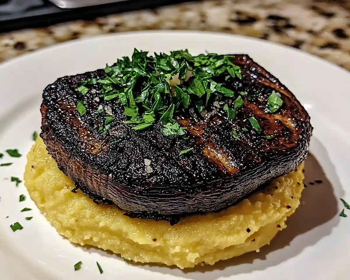 Steak de Champignon Portobello Laqué à l’Ail Noir sur polenta crémeuse