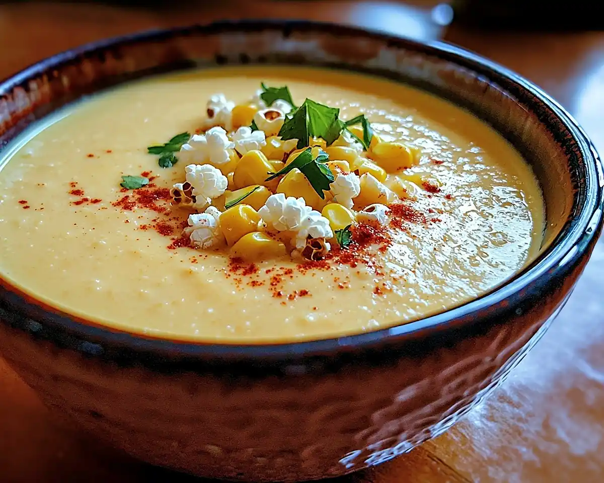 Le Velouté Glacé de Maïs au Lait de Coco, c’est le petit twist frais qui change des classiques ! Doux, crémeux et un peu exotique grâce au lait de coco, il se laisse siroter à n’importe quel moment. Et quand tu ajoutes du Popcorn croustillant et un soupçon de Paprika Fumé, là… c’est le combo qui te fait dire “mais pourquoi j’ai pas essayé ça avant ?”.